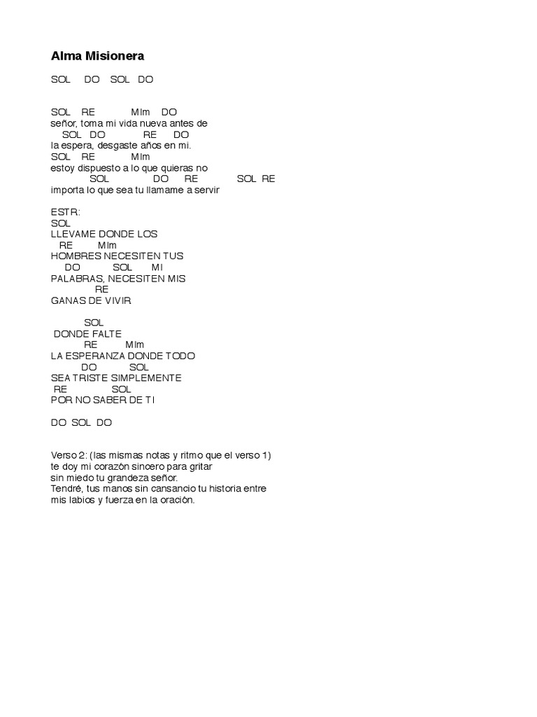 Alma Misionera Acordes Sol - Y asi en marcha ire cantando por calles predicando lo bello que es tu amor senor tengo alma misionera conduceme a la tierra que tenga sed de dios.