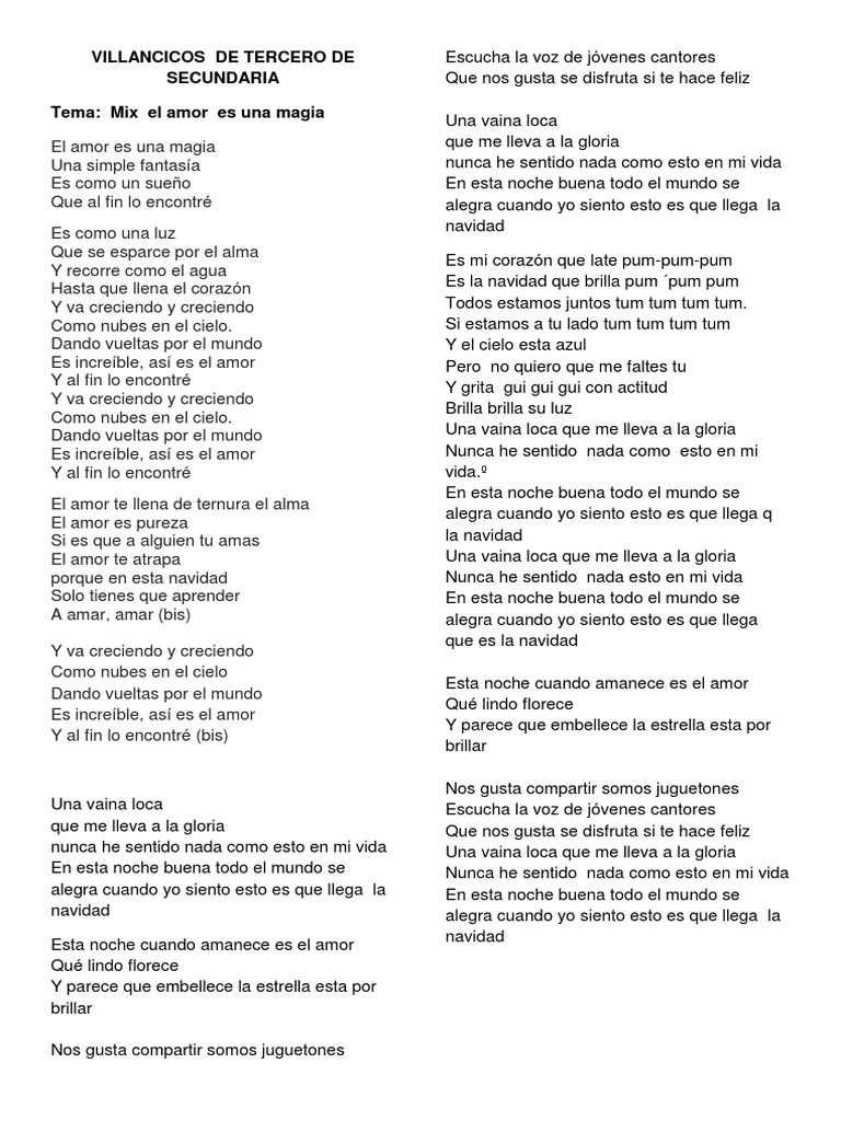 Villancicos De Tercero De Secundaria Tema Mix El Amor Es Una Magia Amor Ocio - Una vaina loca que me lleva ala gloria nunca he sentido nada como eto en mi vida ella me descontrola cuando estamos a solas cuando yo siento eso es una vaina ratata todas las noche ella me desea contigo yo lo hago donde sea se muere porque quiere que la pege a la pared le gustan los tigueres que son juguetones quiere que le cambie de posiciones y le gusta y disfruta duro quiere que le.